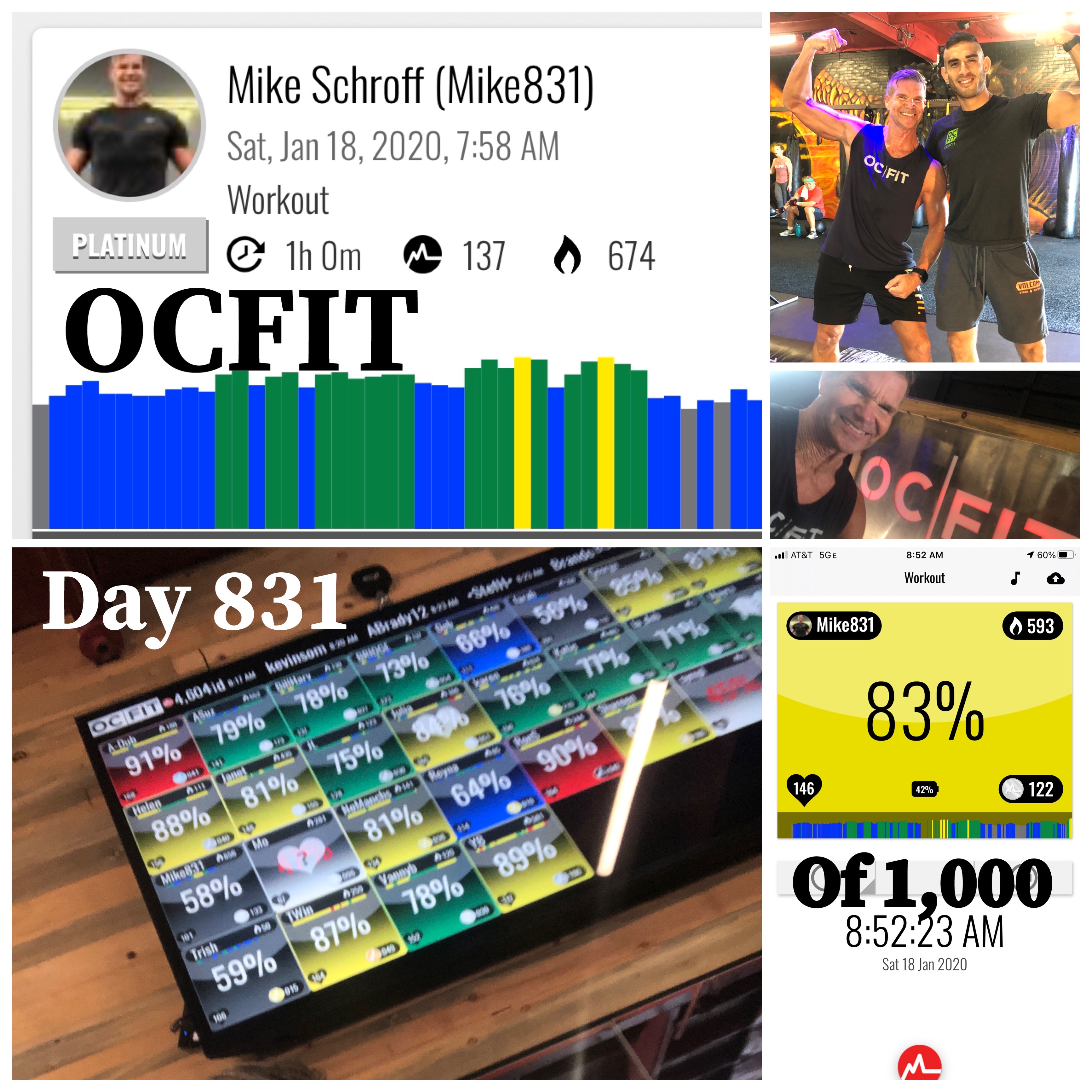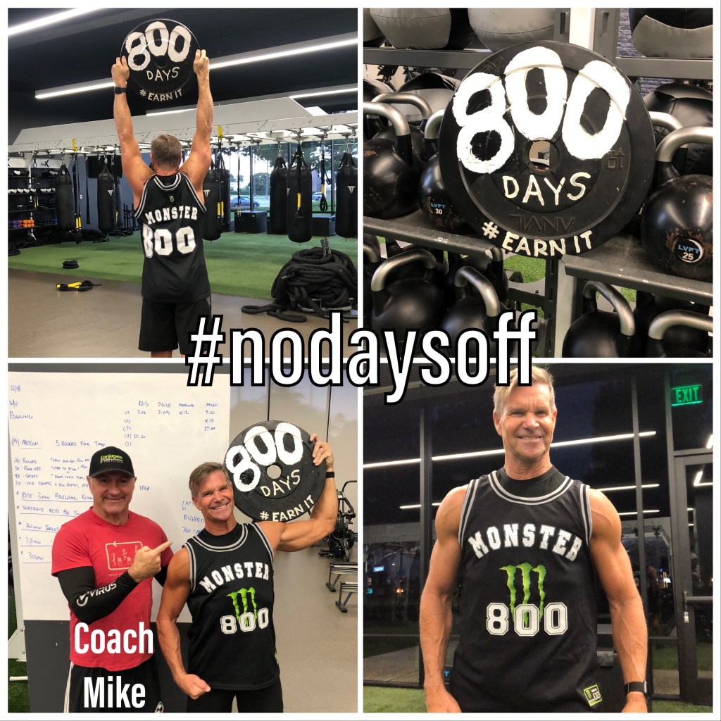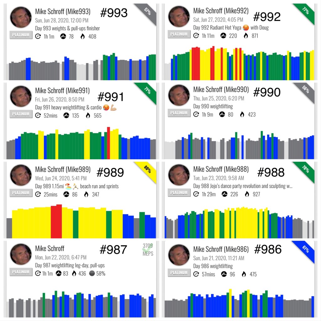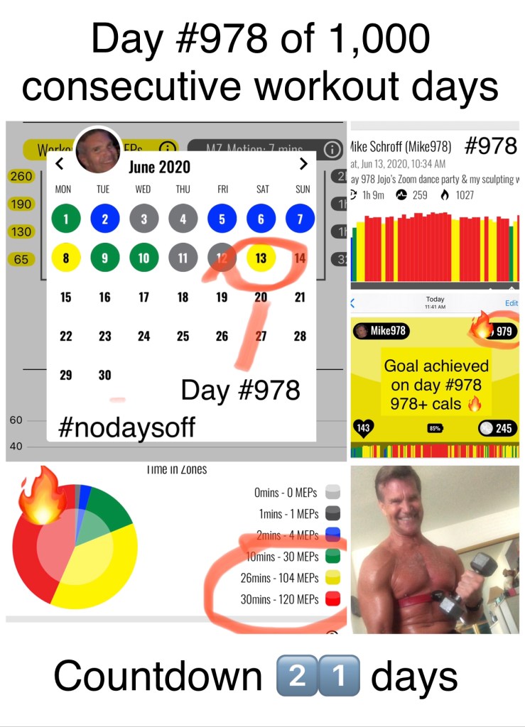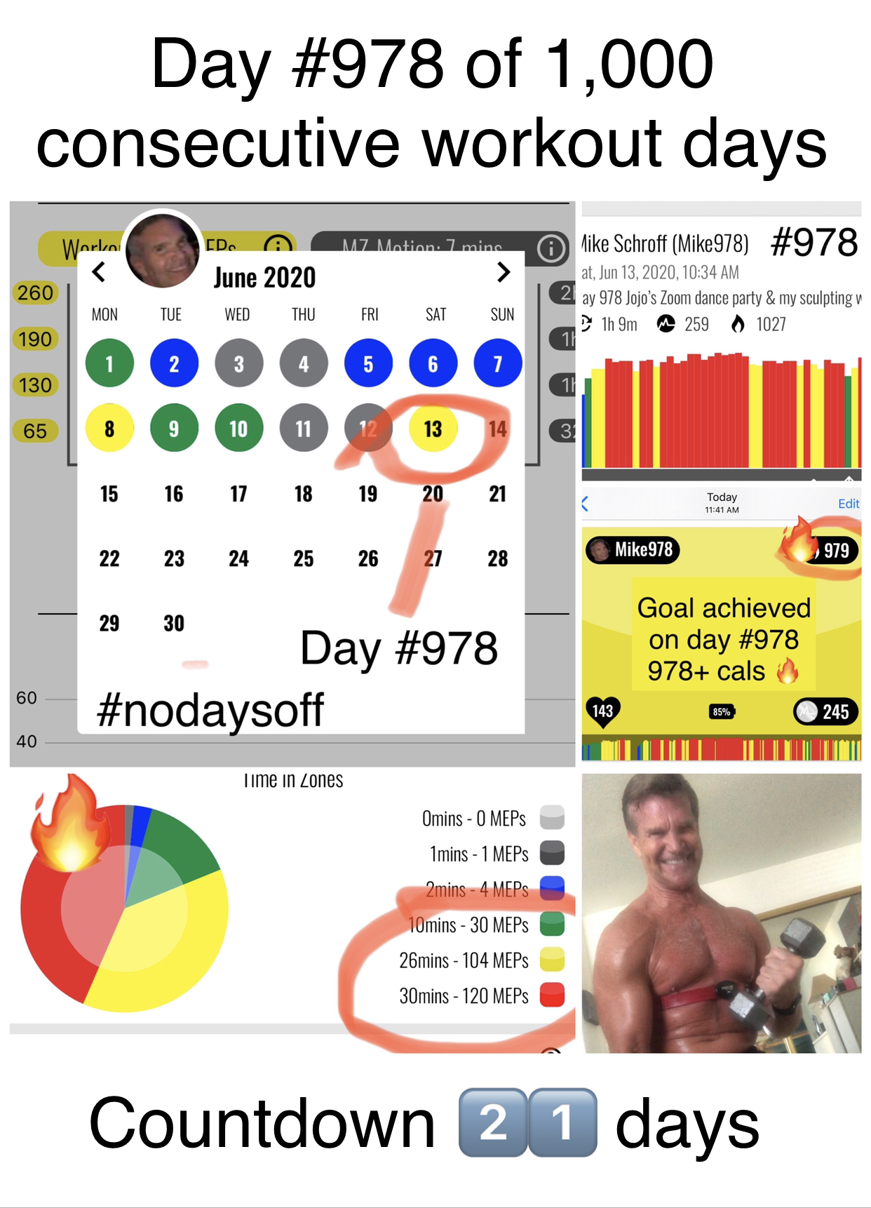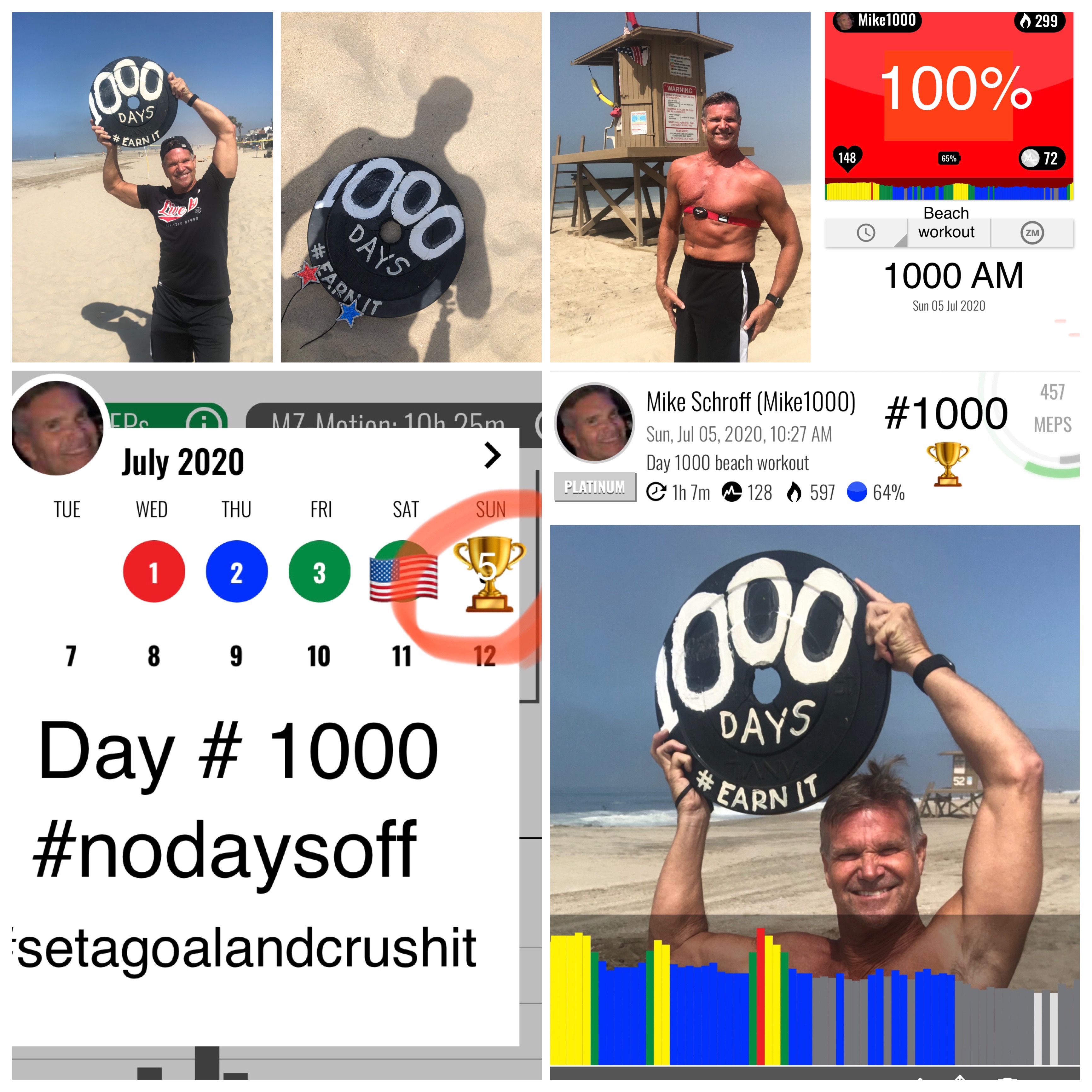 From October 8, 2017 to July 5, 2020 I worked out every day, with no days off…1000 days straight. Some days were hard (or extremely hard), and some were a bit easy, such as a recovery workout day. The criteria was to record a minimum 15 minute workout on the MyZone app, but most workouts were 60 minute HIIT or Spin sessions. Occasionally, I’d do something crazy like plank for four hours (the entire 2018 Super Bowl), push a sled with about 1,200+ lbs., complete 2,018 crunches on Jan 1, 2018, or carry a 150 lb punching bag around the building a few times.