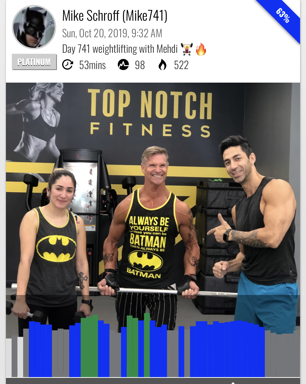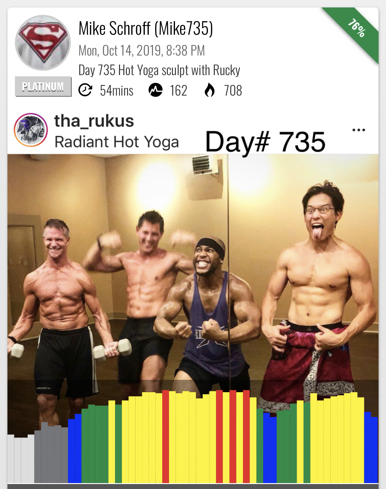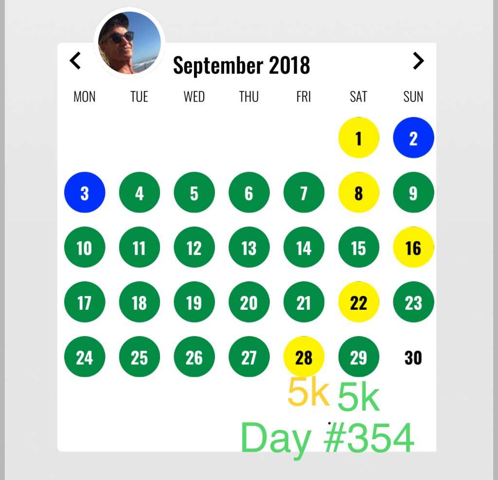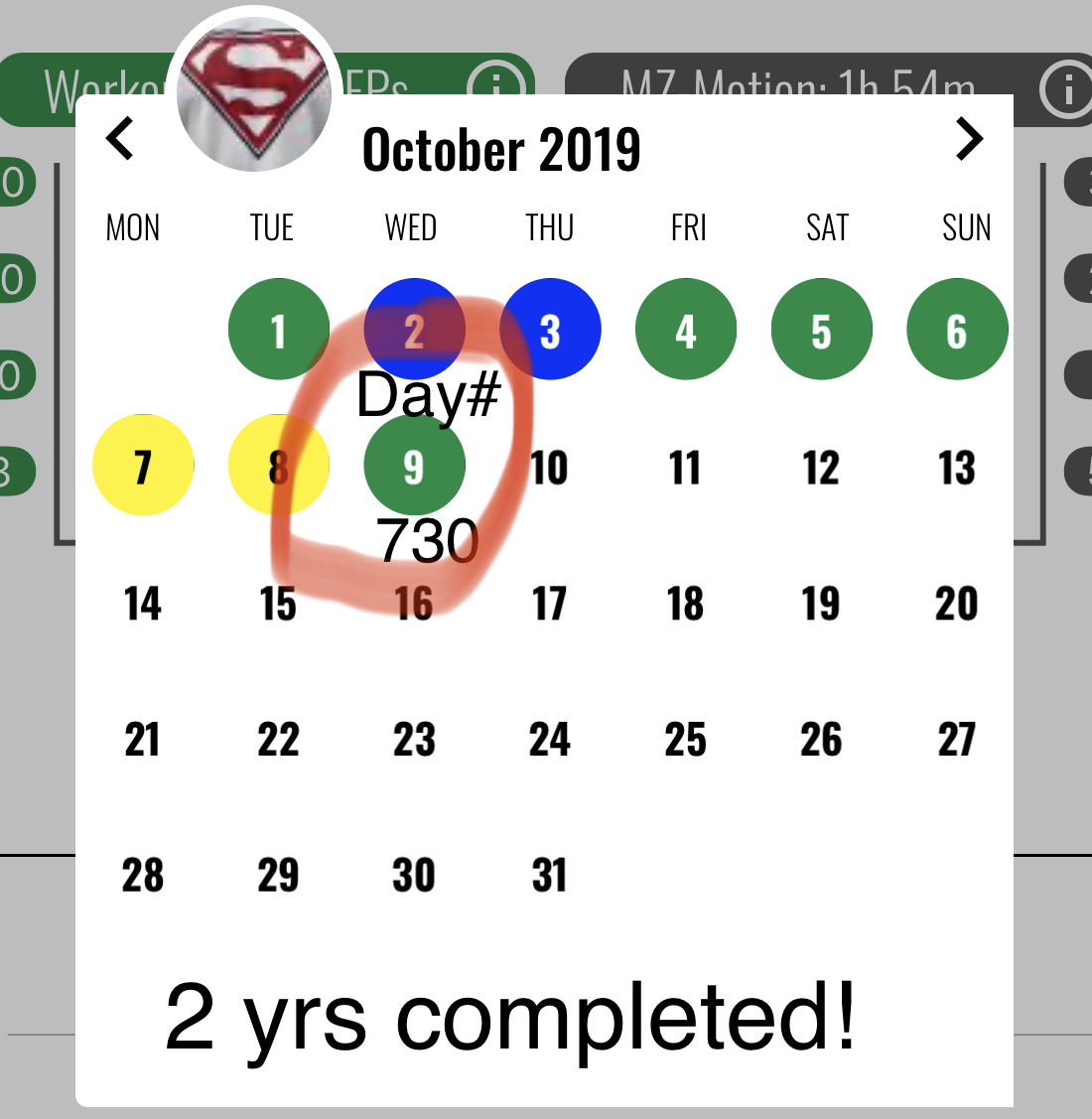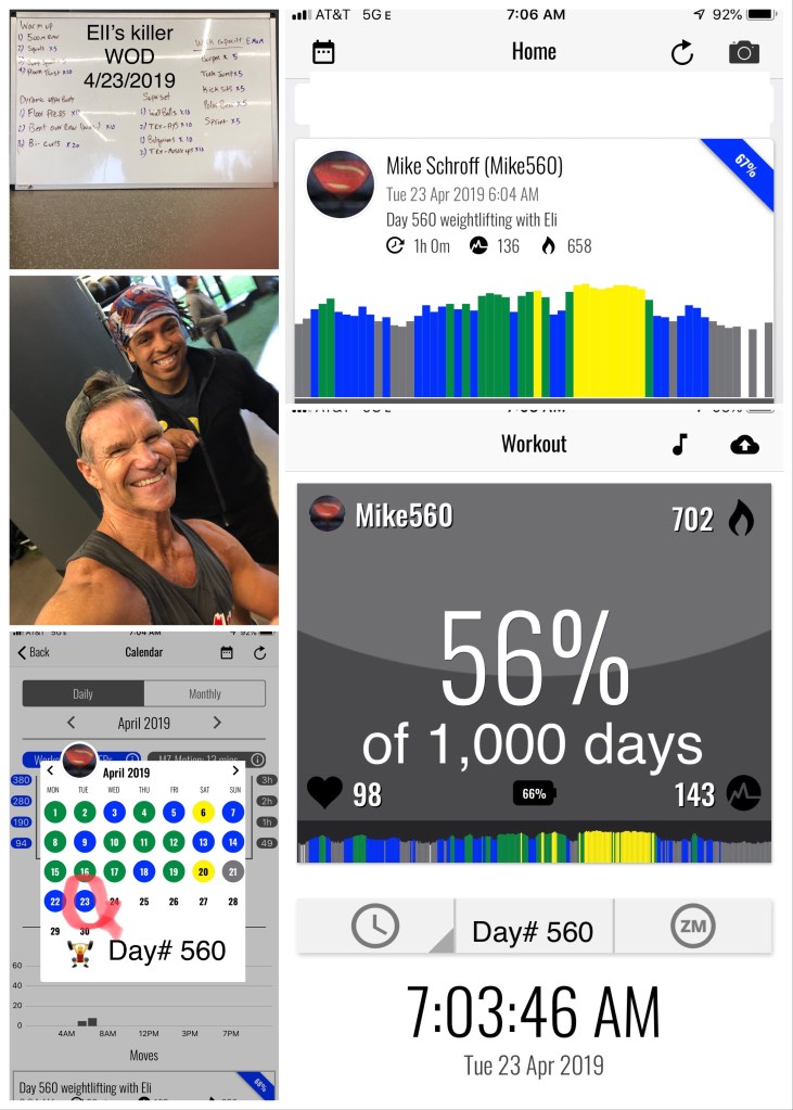 On October 8, I went to a yoga class with a friend. Turns out, that was Day# 1. and the start of the 1000 day streak…I just kept going each day, being out of work with plenty of time (and plenty of reasons to keep my head clear and focused). Subsequently, on November 1st, I got a new job near Kinetic Gym, and I joined that day, and started going on November 2nd. At Kinetic, everyone was using the MyZone program to track their workouts. From that moment on, I wore the MyZone belt to track every workout (and I still do to this day in 2025). Tracking my progress with MyZone, and using the calendar, really helped me share (and prove) my progress…it’s all recorded in MyZone!