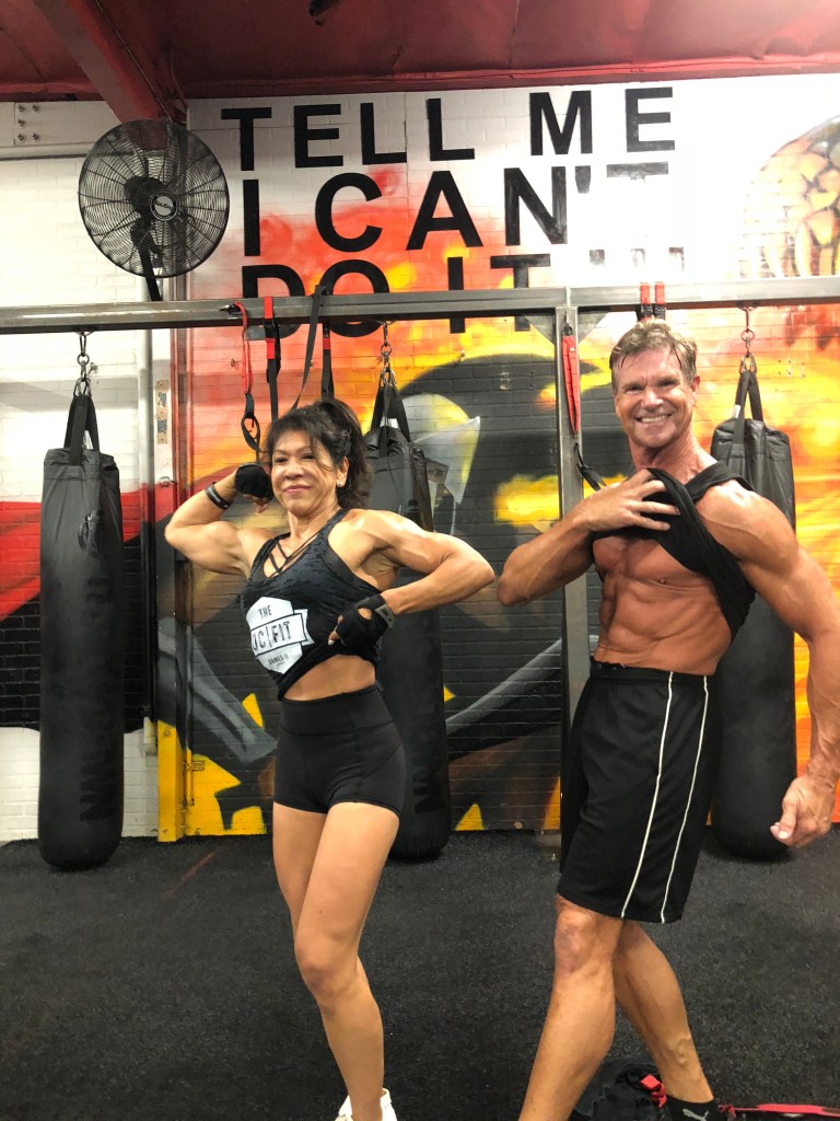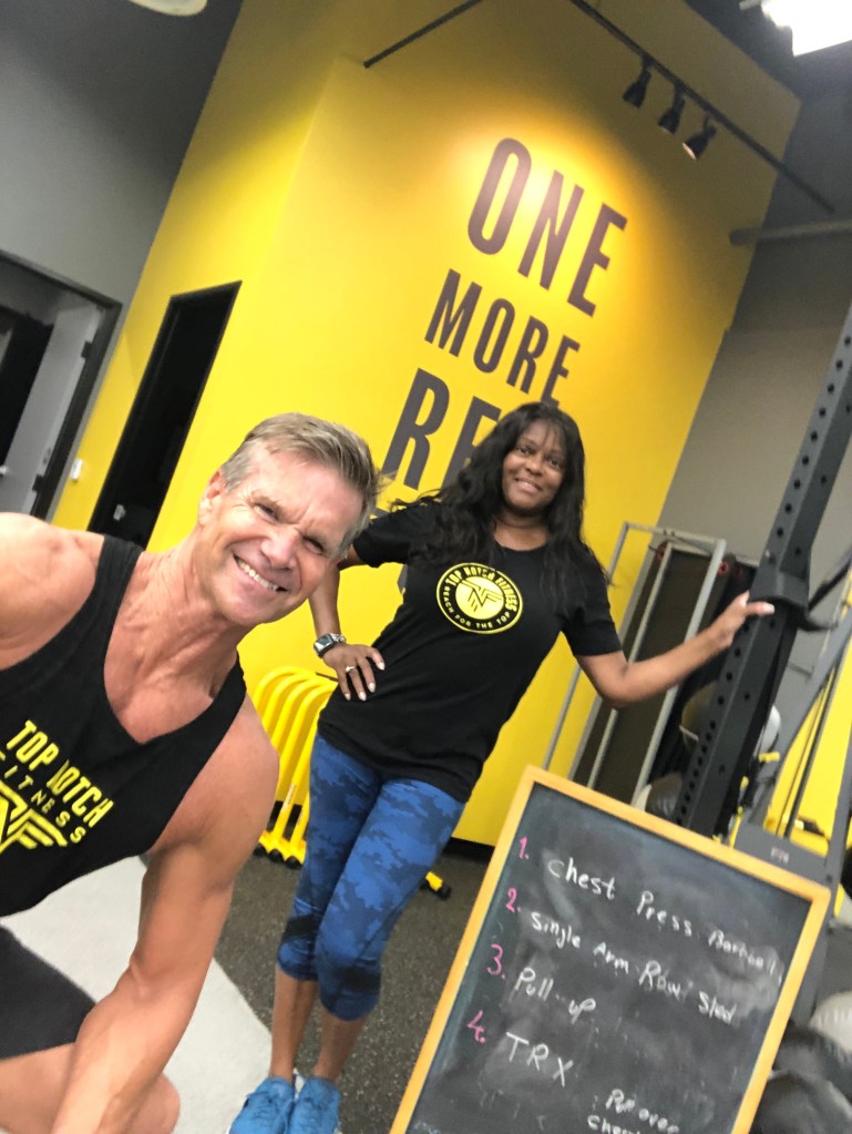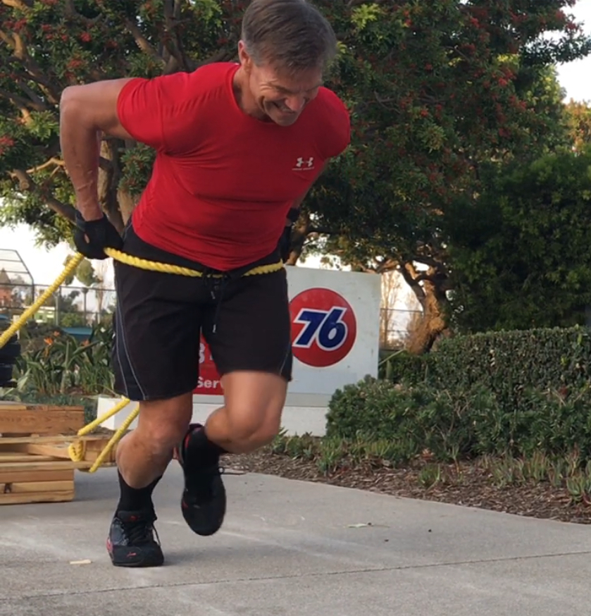 We used to have fun doing crazy workouts to keep it fun and interesting. Here’s a pic of me pushing Jamie (185 lbs), plus another 150 lbs of weight. Fun!