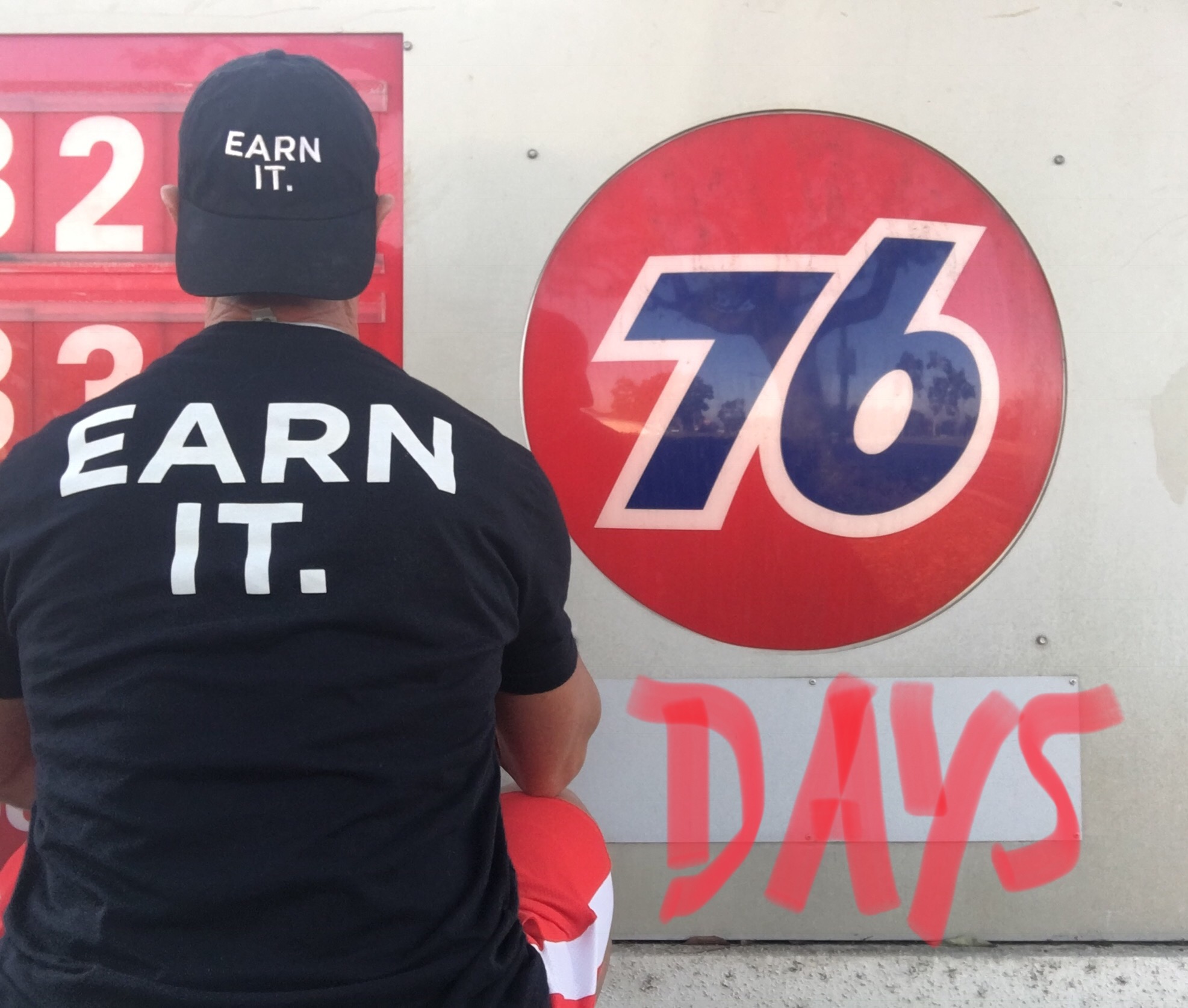 Day 76…pulling a heavy sled up the sidewalk in front of a 76 gas station lol