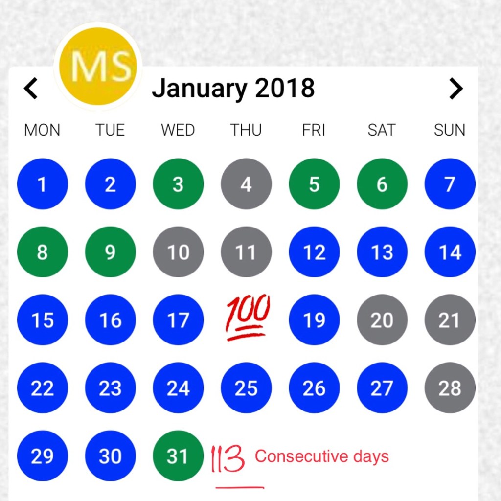 Jan 18, 2018. 100 consecutive days. Somebody said, “Why stop at 100? Keep going!” ok, i will.