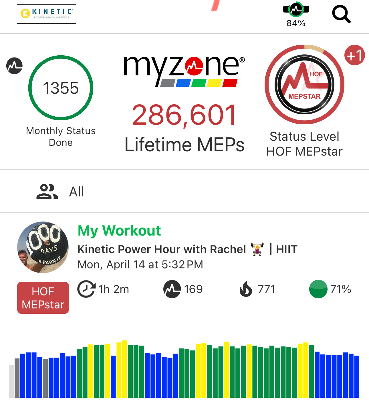 Rachel’s Power Hour: Max Muscle! Monthly MyZone MEP count requirement met! (1300 MEPS). Level: Hall of Fame MEPSTAR!